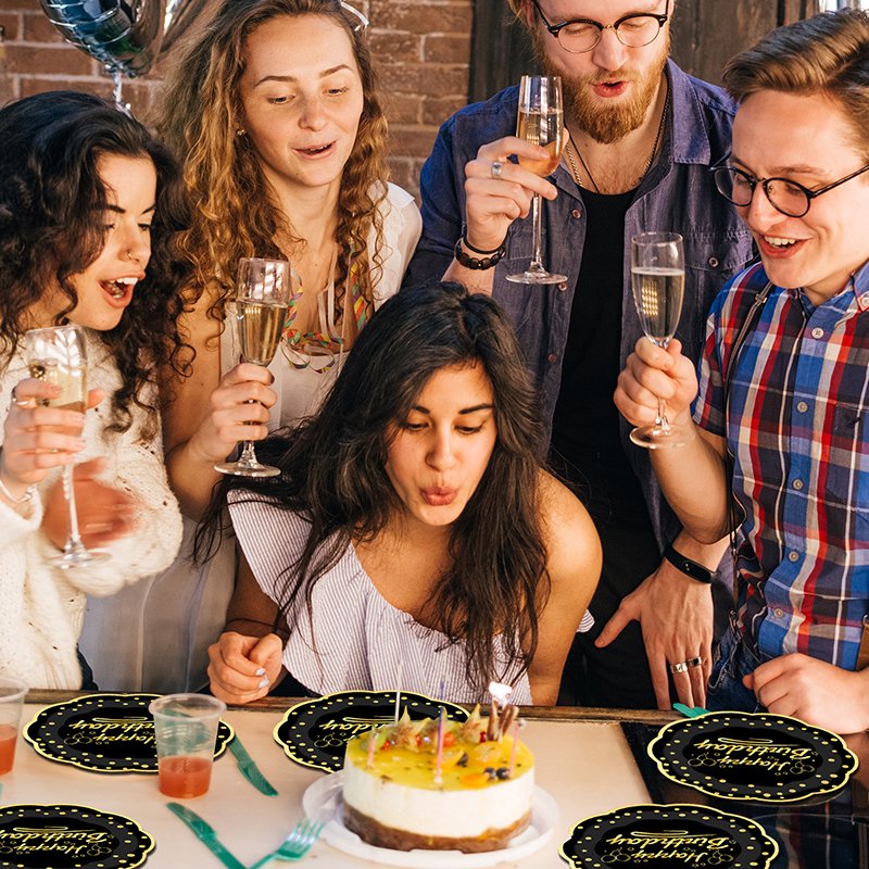 Made from thick, durable paperboard, these plates are sturdy enough to hold cake slices, snacks, pastries, and light party foods. Because they are disposable, cleanup becomes quick and effortless after the event. Furthermore, the hot-stamped gold finish does not fade easily, keeping the plates bright throughout the celebration.
