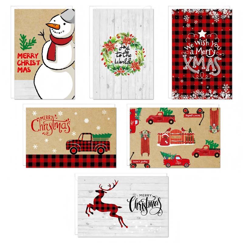 Each card in this Christmas card set is produced using quality paper materials that provide a smooth writing surface and durable structure. The printing delivers clear details and vibrant colors, ensuring the festive designs remain visually appealing throughout the holiday season. Explore the whole category of greeting cards in bulk. Additionally, the sturdy cardstock helps prevent bending or damage during handling, mailing, or display, which is essential for retail and bulk distribution environments.