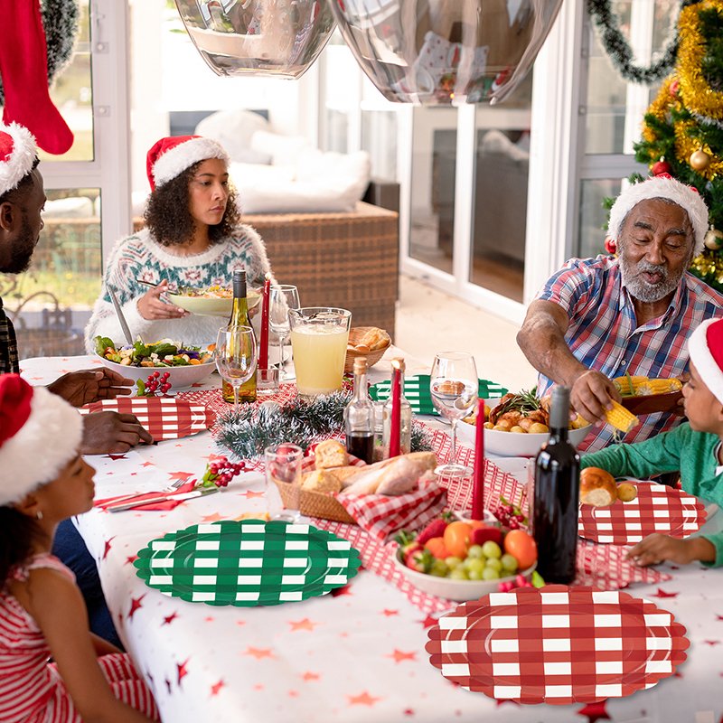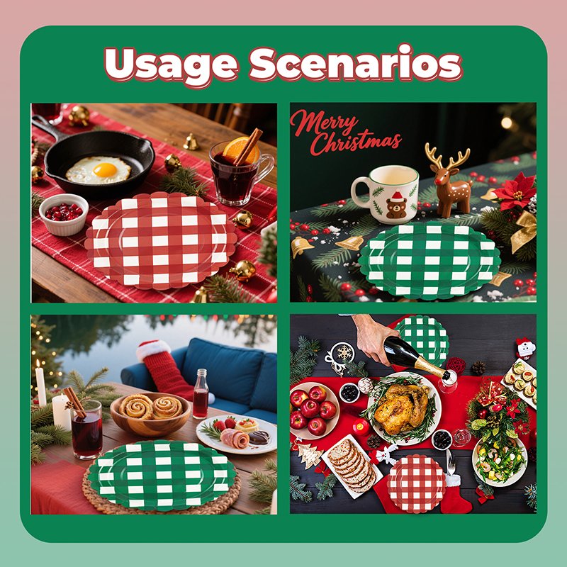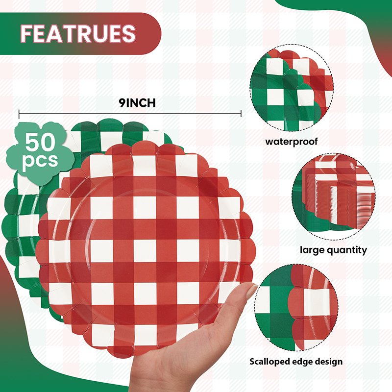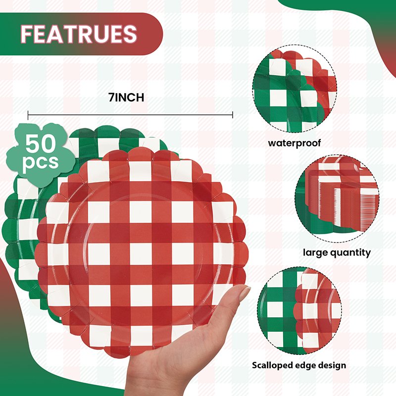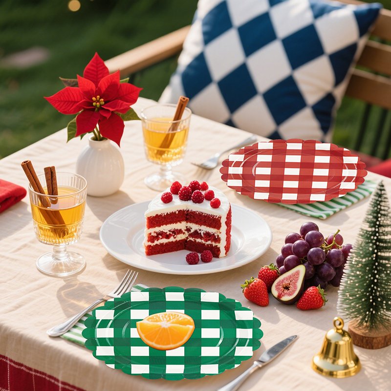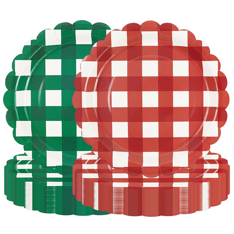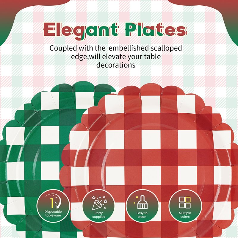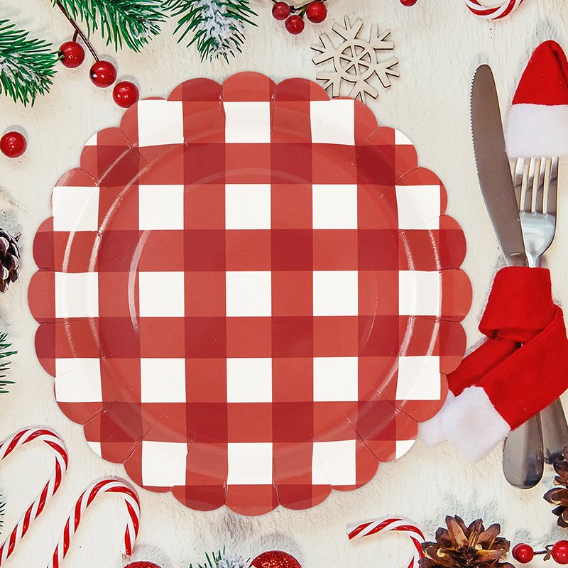 The design features a classic red and green checkered gingham pattern inspired by traditional Christmas décor. In addition, subtle lace-style stripe accents enhance the festive aesthetic while maintaining a clean and organized layout. Consequently, retailers can easily bundle these plates with matching Christmas cups, napkins, and table covers to create coordinated holiday party kits.