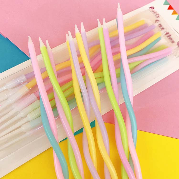 These candles are manufactured using standard candle-grade wax with stable color pigments. As a result, the candles burn evenly while maintaining their curved shape. Furthermore, the smooth surface finish ensures a clean appearance when placed on cakes. Explore all types of party candles.