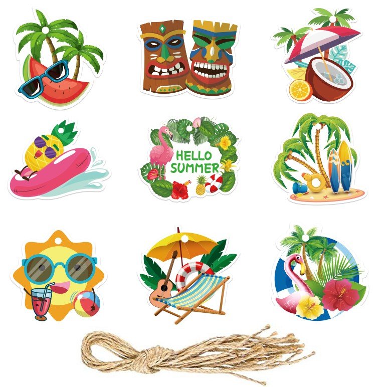 This summer Hawaiian hanging ornaments set includes cheerful designs such as flamingos, palm trees, hibiscus flowers, beach chairs, flip-flops, and “Hello Summer” signs. Each ornament is printed clearly and paired with a natural jute rope or spiral hanger. Therefore, setup is quick and effortless for decorators and event planners. Explore all hanging ornaments.
