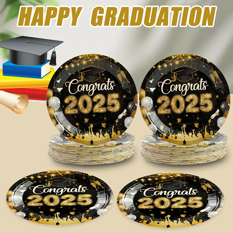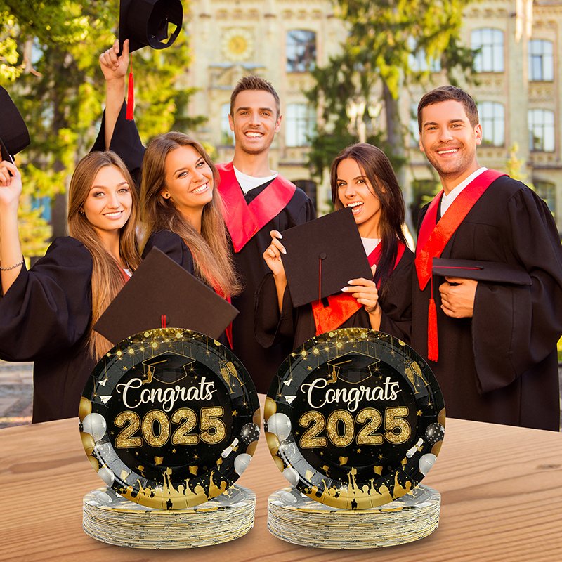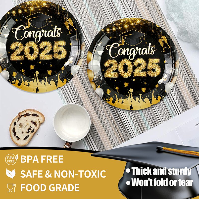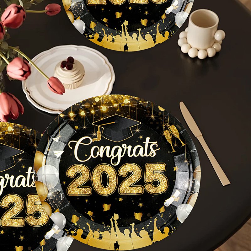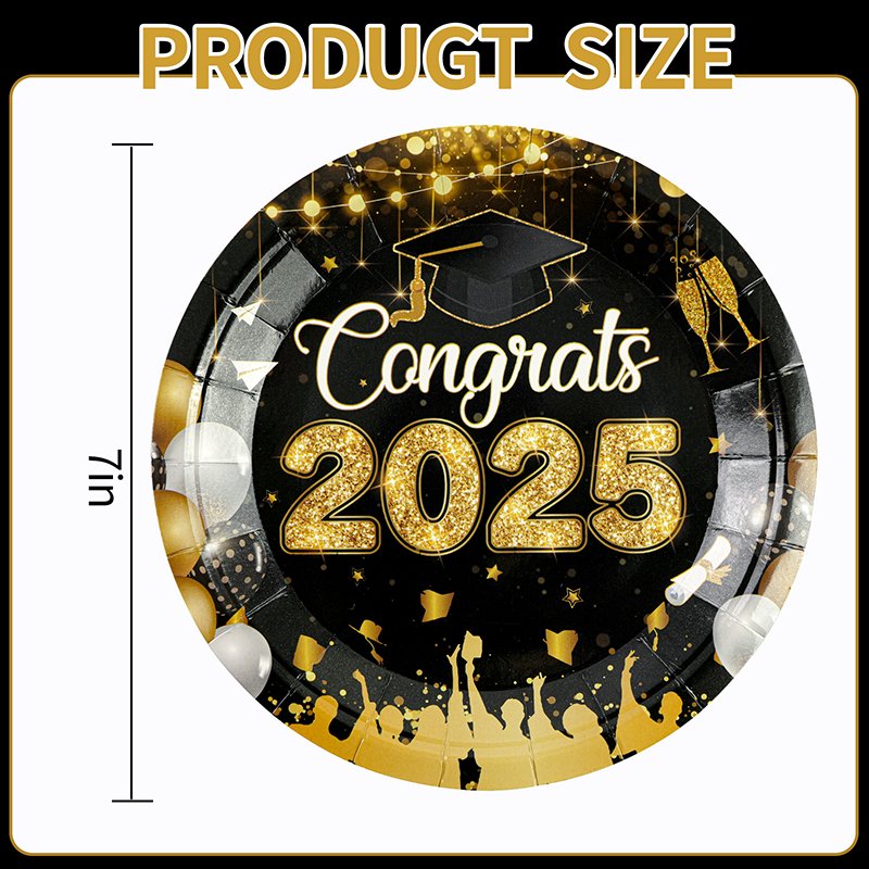 Graduation Paper Plates are a premium seasonal disposable tableware product designed for wholesalers, distributors, importers, and party supply retailers. This 50-piece 7-inch set features a luxe black background with elegant gold “Congrats 2025” text and festive confetti patterns. As a result, it delivers a modern and upscale presentation for graduation celebrations.