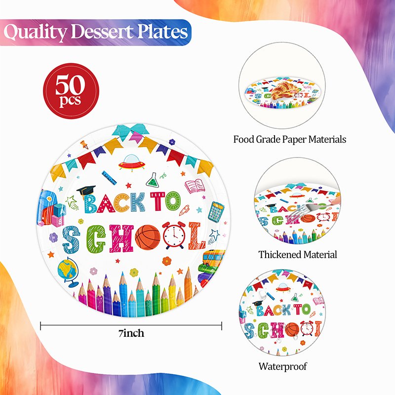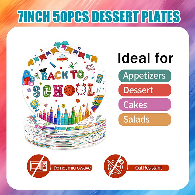 School Themed Paper Plates are a high-demand seasonal disposable tableware product designed for wholesalers, importers, retailers, and party supply distributors. This 50-piece 7-inch “Back to School” paper plate set features colorful school supply designs including books, pencils, apples, and other classroom-themed icons.